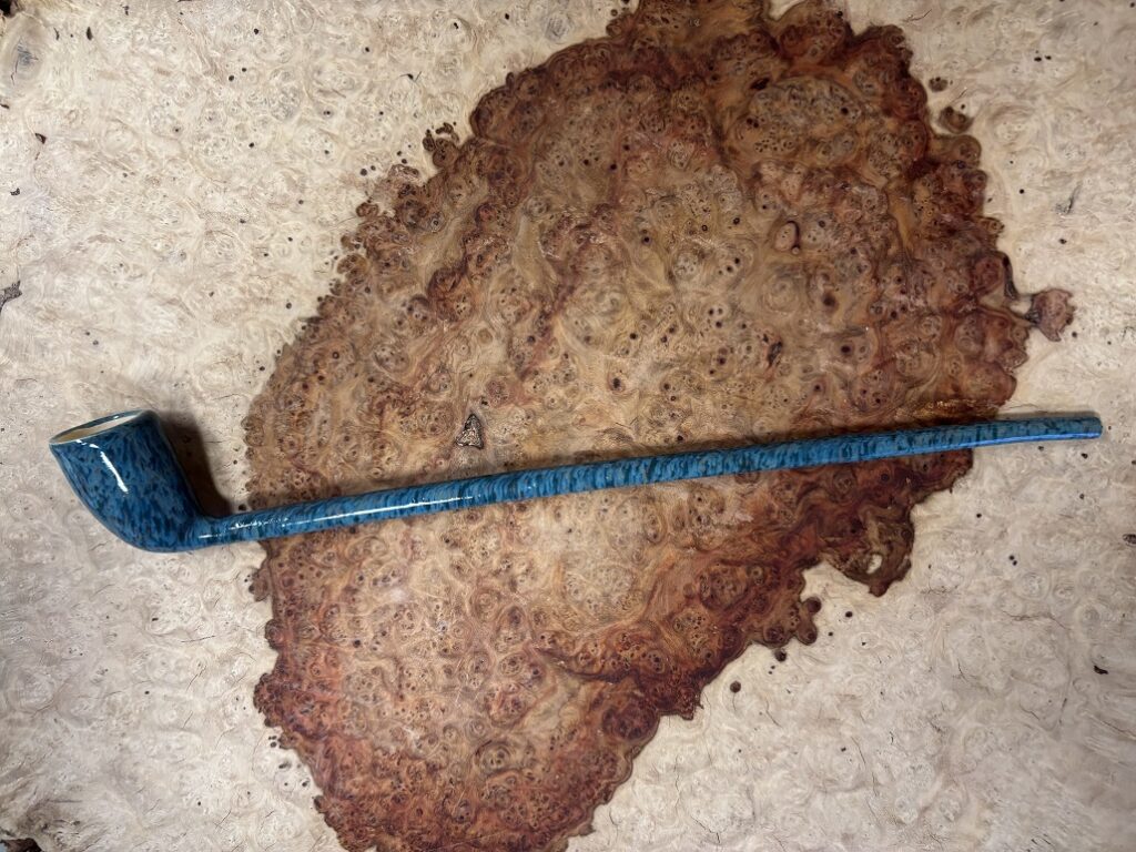 Durch geringe Sauerstoffzufuhr während des Reduktionsbrandes erhielten die schwarzen Pfeifen einige weiße Flecken.